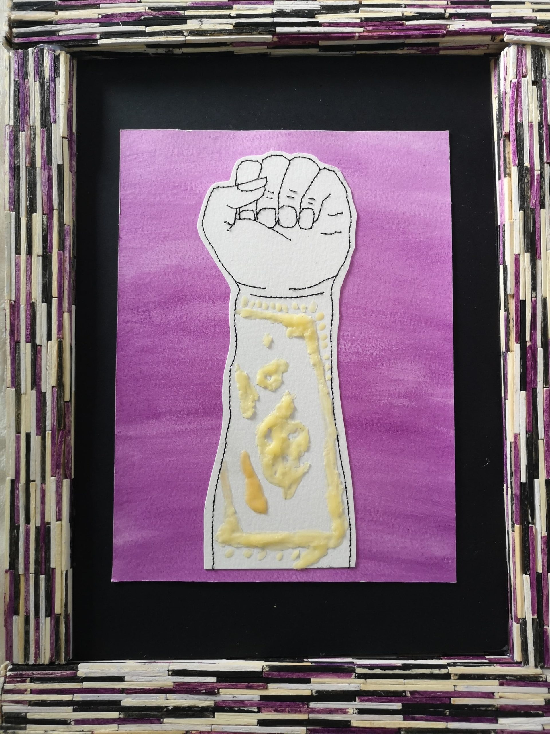 I wanted to use the nonbinary flag colours to represent that gender identity doesn’t determine physical expression – there was a way I needed to be and that makes me feel whole, and it doesn’t lock me into a gender binary. The background is purple ink, the arm and fist is water colour paper that I sewed down with a machine to echo the idea of stitches and surgery, and the keloid scaring is yellow candle wax that I painted on and then had to melt a little to give it a smooth surface. It isn’t a one-to-one comparison as my scarring pattern is pretty complex, and my skin and scars are much more supple, but it’s pretty close.